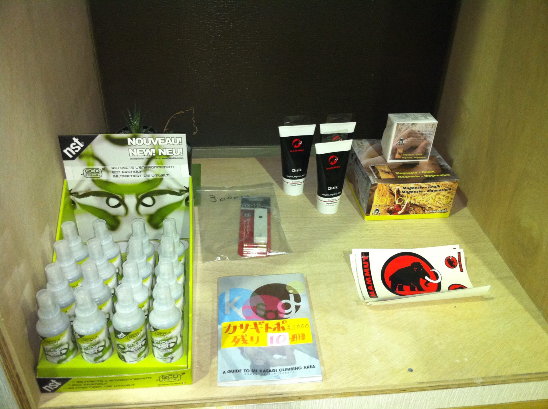 チョーク入りました。 2011年7月19日 最終更新日時 : 2011年7月19日 久保マンムートのリキッドチョーク 1800円CAMPのチョークブロック 450円マンムートのステッカーは、差し上げます。 気長に待てる方なら、ファイブテンのシューズやマンムートの商品を取り寄せできます。カタログも一緒に置いておきます。取り寄せについて詳しいことは聞いて下さい。 月会員の方は、ファイブテンのシューズを、一割引で販売しています。例えば、定価15750円のアナサジベルクロが、14175円で買える。在庫が無いので、取り寄せに日数がかかるのをご了承ください。